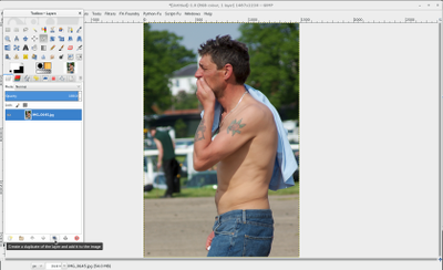 Open your image up in GIMP and duplicate the base layer, either by clicking the "Duplicate Layer" button in the Layers dialog or by pressing Shift+Ctrl+D.