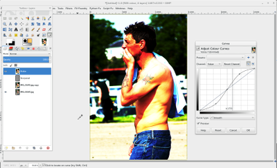 Finally for this stage of the process, apply a contrast curve to this sharpened layer. First you need to create a new layer from the currently visible image by right clicking your contrast layer in the Layers Dialog and selecting "New From Visible", you should also hide the High-Pass filter layer and your original contrast layer. Now open up the "Adjust Colour Curves" dialog from under the "Colours" menu - right click, Colours->Curves.