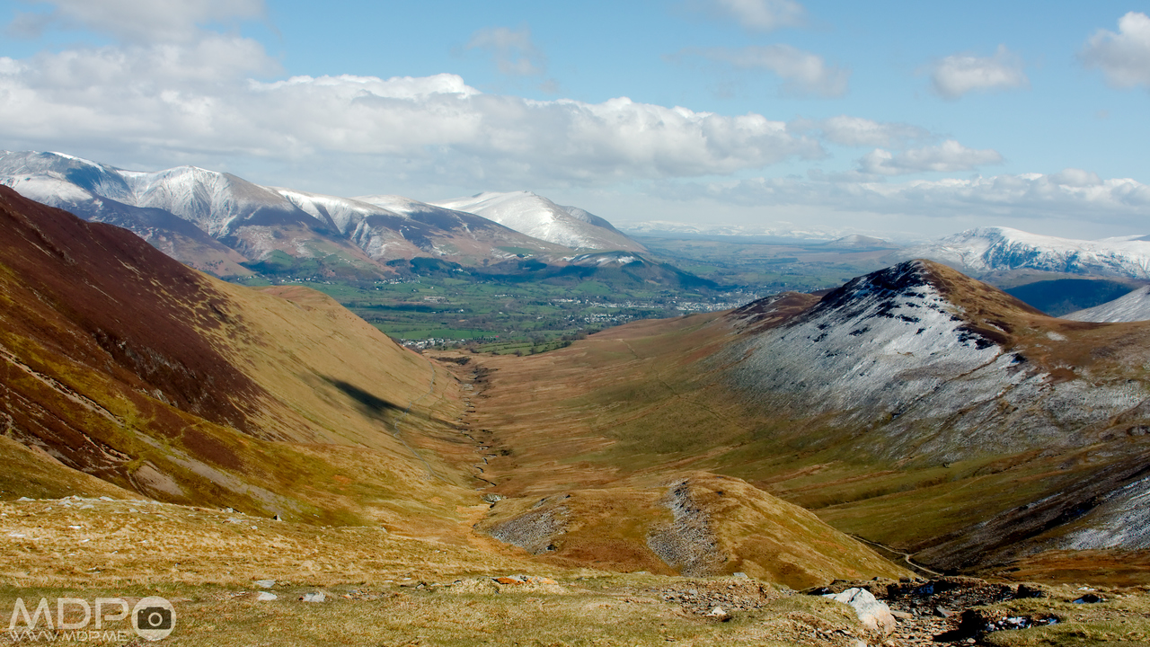 Looking back down the valley from the top of Force Crag. You can see the miner's track leading up to the old, abandoned Force Crag mine. The track runs parallel to Coledale Beck. In the distance are the snow covered peaks of Skiddaw and Blencathra. The peak to the right of the picture is Stile End.