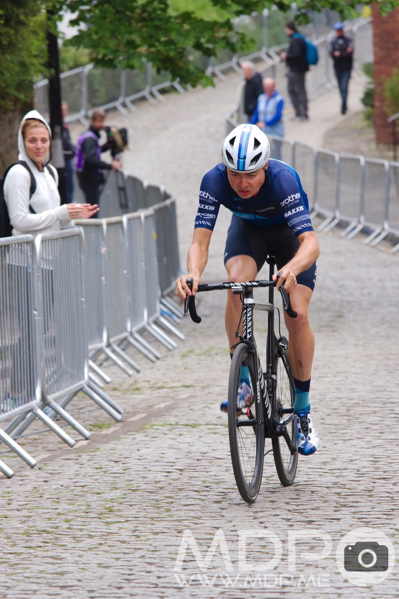 Harry Tanfield didn't look as if he enjoyed the cobbled climb too much. Nevertheless, his team, Canyon Eisberg, finished the event second overall, behind Madison Genesis.