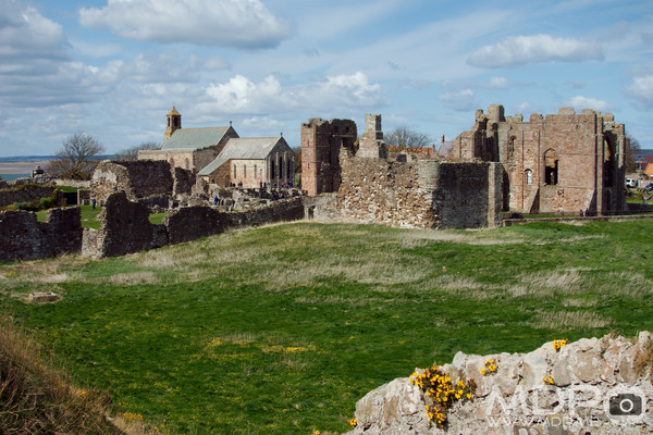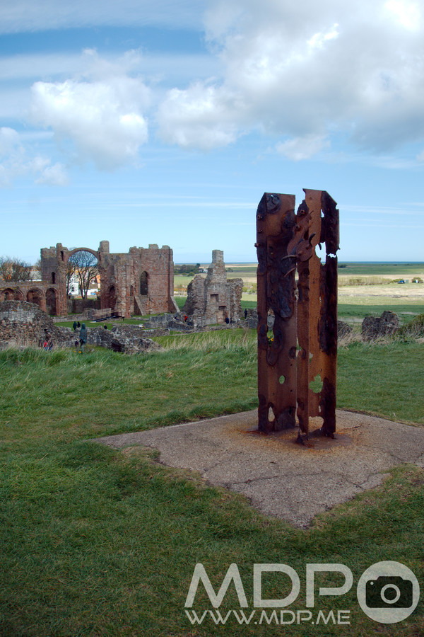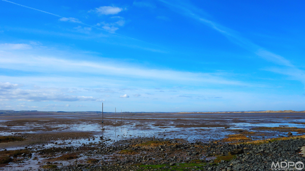 Pilgrim's Way, Lindisfarne. Holy Island has been a place of pilgrimage since St Aidan established his monastery here in 635. The vertical poles mark the safe route from the mainland to Holy Island.