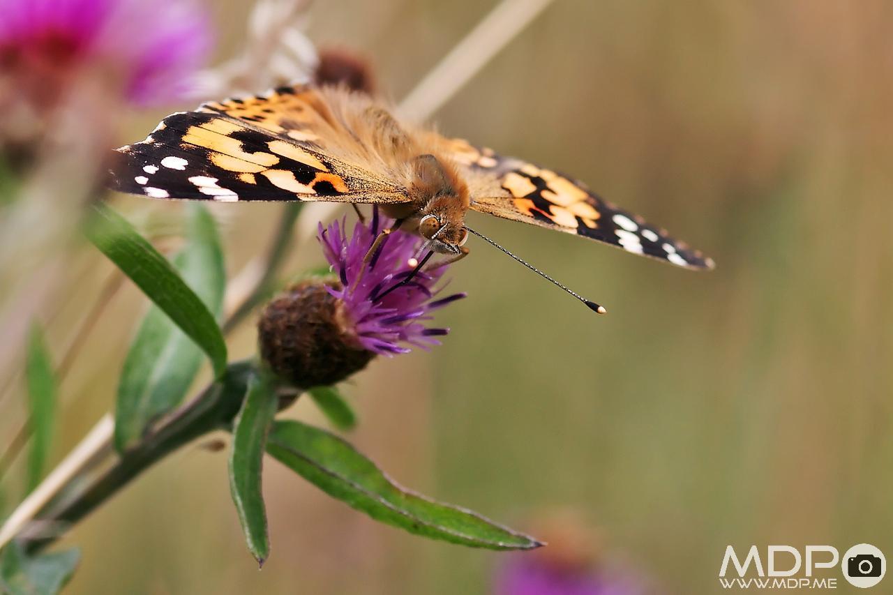 Macro shot of a Painted Lady (Vanessa cardui) butterfly, front on, feeding on a thistle. Painted lady butterflies migrate from North Africa to the UK in summer. In some years,they can be seen in huge numbers. This picture was taken in 2009, near Ombersley, Worcester in a filed which was literally swarming with them.