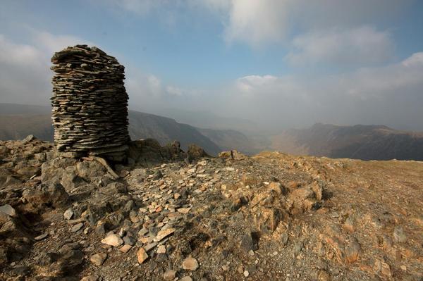 Cairn on the summit of Dale Head in the Lake District with the Newland's Valley in the background. About the halfway point of the Newland's Valley Horseshoe walk.