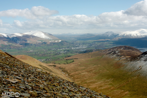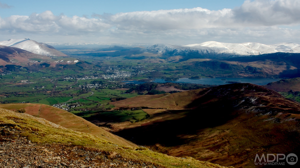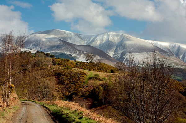 Taken at the bottom of the miner's track leading up to Force Crag, looking back towards the snow covered peaks of Skiddaw. The miners track runs from just outside of Braithwaite to the old, disused Force Crag Mine.