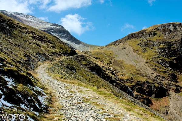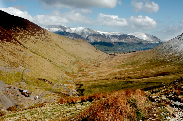 Looking back down the valley. You can see the miner's track leading up to the old, abandoned Force Crag mine. The track runs parallel to Coledale Beck. In the distance is the snow covered Skiddaw.