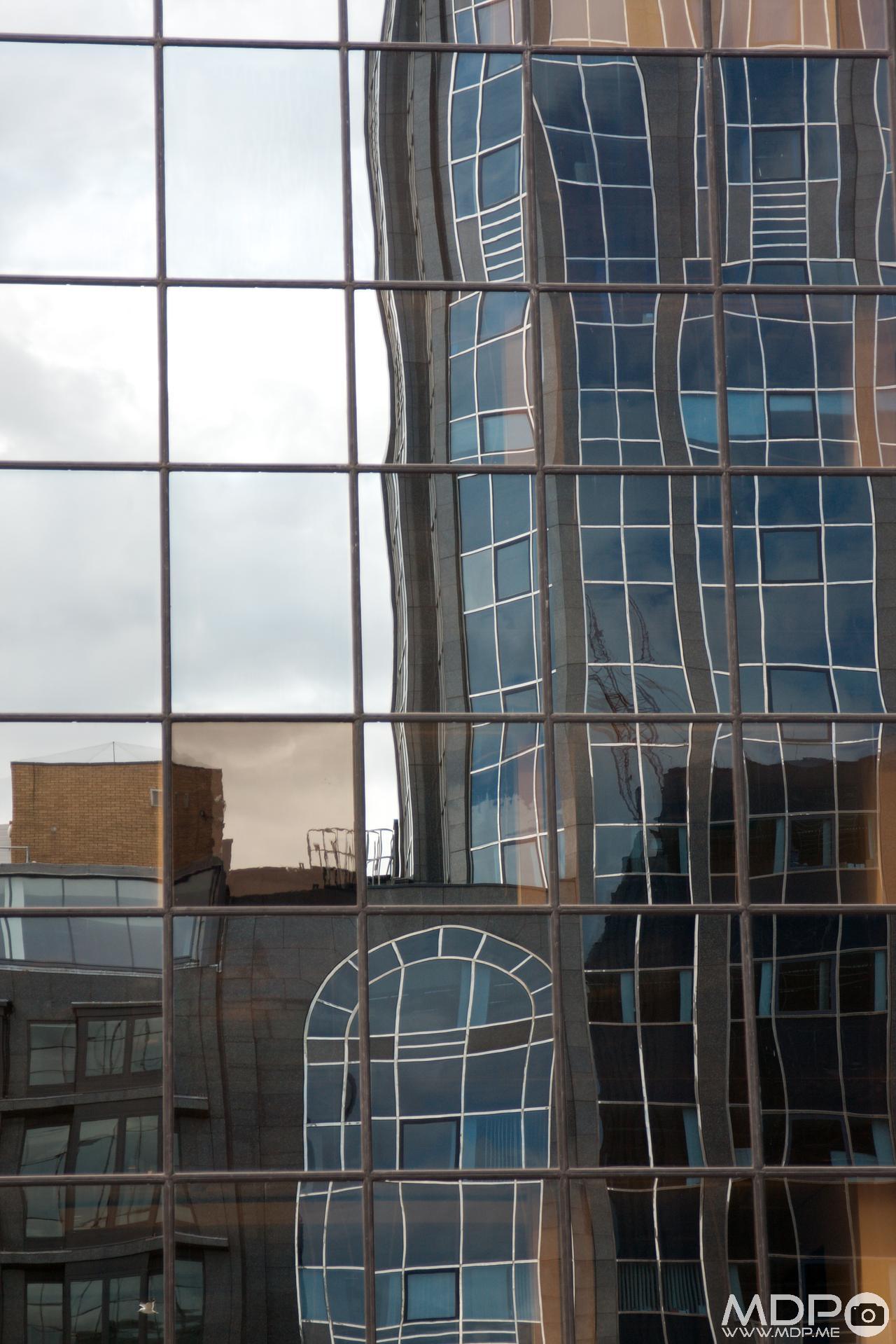 Reflections of buildings in mirrored office windows in Birmingham, UK.